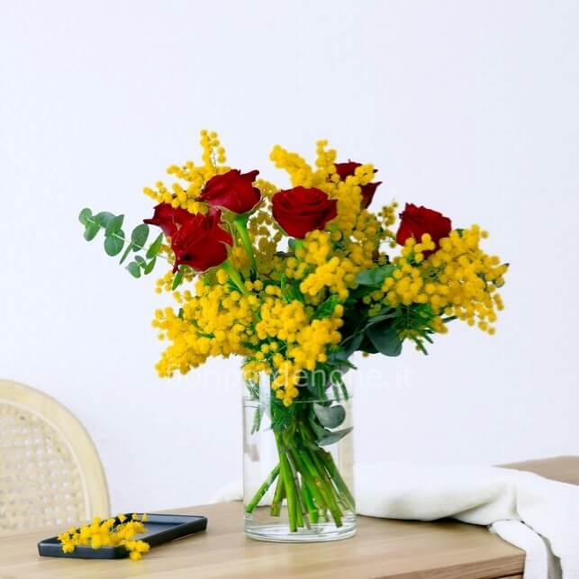 | bouquet rose rosse e mimosa cod. 84291 | Importo € 35,00 | Num. steli : |
