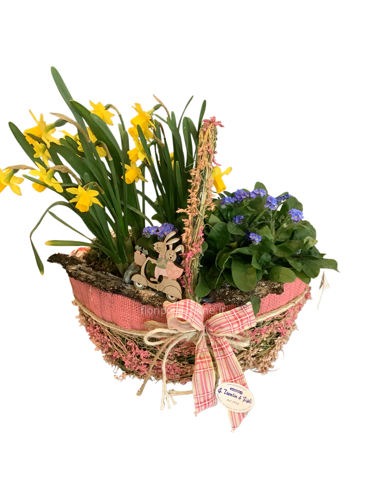 | Cestino con narcisi e “ non ti scordar di me” Cod. 126684 | € 22,00 | Quantità : | |