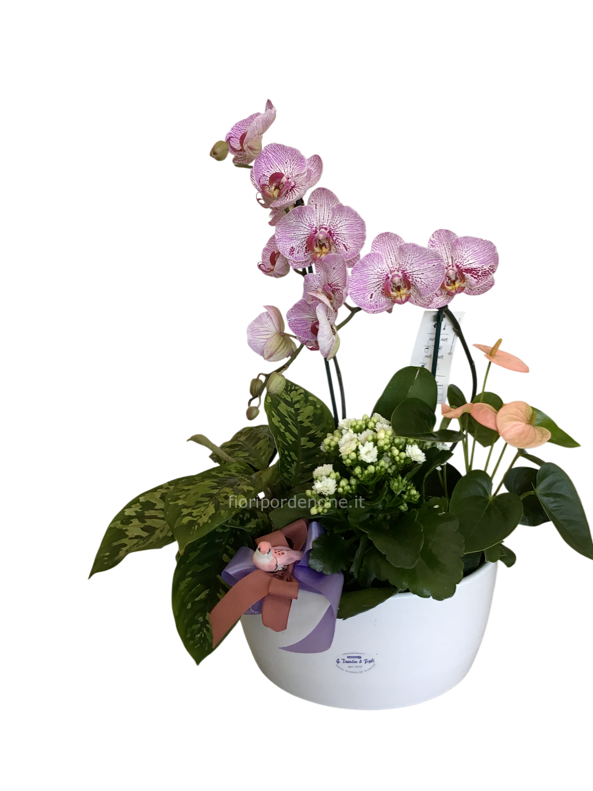 Ciotola con orchidea ed altre pianteda interno