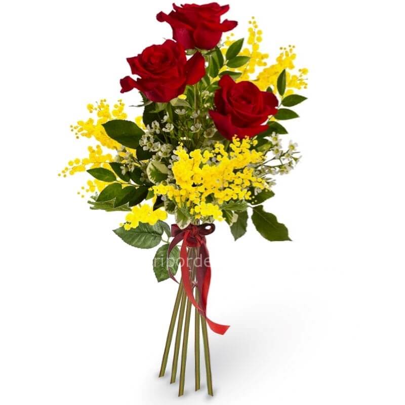 rose rosse a stelo corto e mimosa